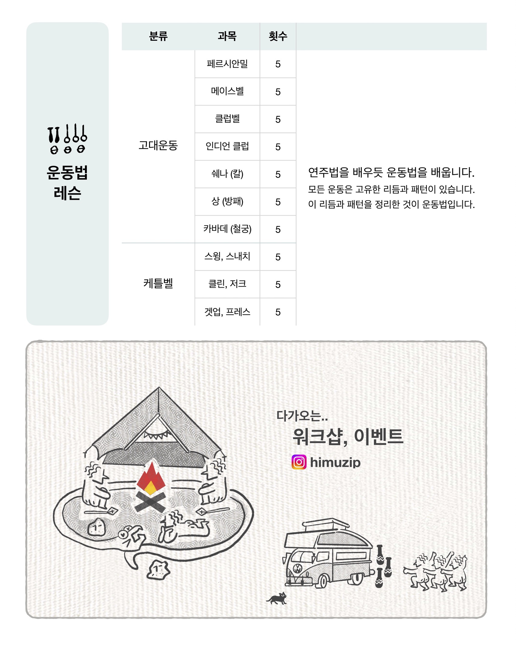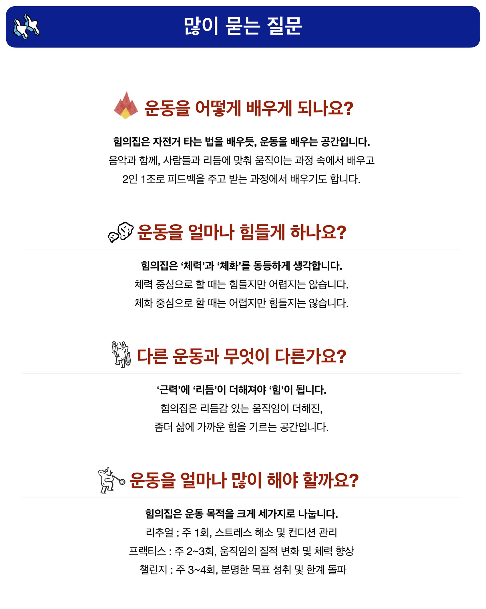 힘의집은 복잡한 장식을 걷어낸 가장 원형적인 형태의 운동을 합니다. 힘의집은 가르치는 공간이 아닙니다. 여러분 곁에서 함께 호흡하고 움직입니다. 서로의 감각을 잇는 흐름 속에서 자연스럽게 배우게 하고, 고유한 리듬을 찾아 깊이 몰입하도록 돕습니다. 힘의집에서 매 순간 깨어있는 감각으로 내 안의 힘을 알아차리고, 몸과 마음에 힘이 가득하게 해보세요.